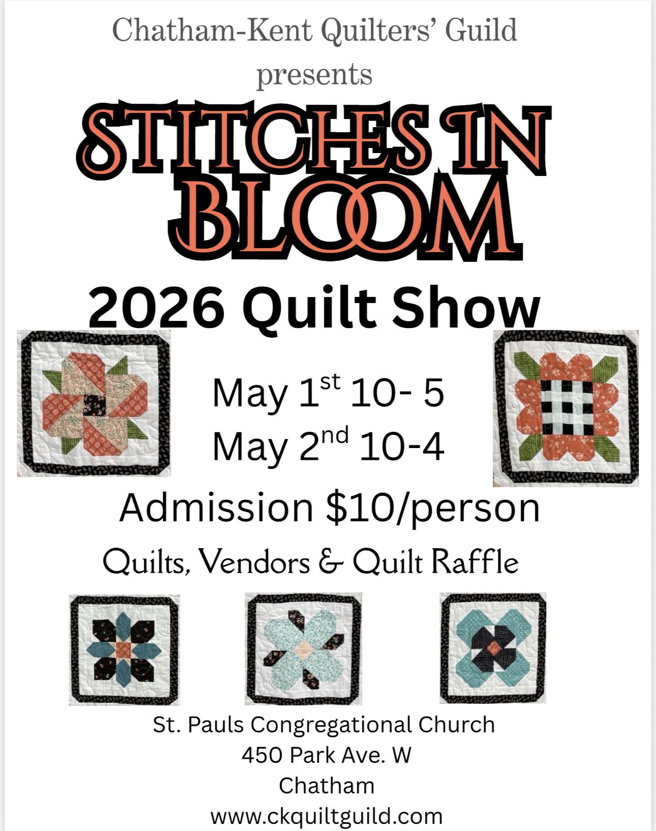 The Chatham-Kent Quilters” Guild is hosting its 8th triennial quilt show “Stitches In Bloom”, May 1 - 2, 2026. There will be a wide display of beautiful quilts, vendors on […]