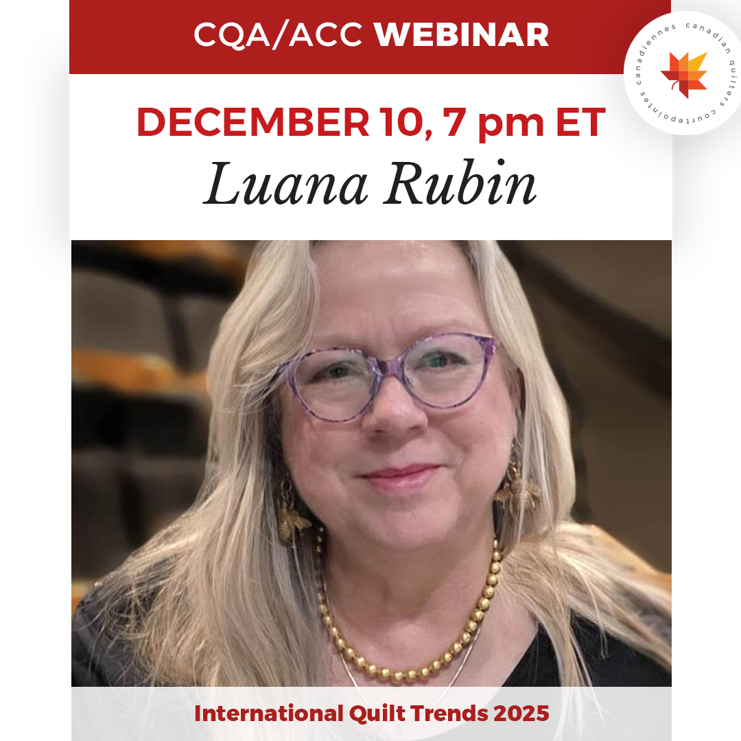 Take a trip around the world with 200 quilt images featuring trends in contemporary quiltmaking. See how quilters in different countries use current events, art history, climate change, activism and pop culture as inspiration for unique works of art, and how Modern Quilting continues to expand and change as a design influence. Color trends and techniques will be discussed, in this review of quilt art trends over the last year. Includes quilts from exhibits from around the world, and future trends for quiltmaking. Special updates from Japan, Washington DC, Birmingham UK, Colorado, Taiwan and Houston Texas 2025 quilt festivals. Luana is transitioning to being a full time quilt artist so she will also share some of her recent work at these various quilt shows. Be sure to have a notebook to jot down inspirational ideas for your next year of quiltmaking! This talk is a fundraiser for Quilts for Survivors.
