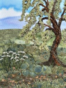 Once the landscape is assembled, students will explore details like fences, rocks and trees that can be added with fabric and embroidery. Finishing and stretching techniques will be demonstrated in class so you can complete the project.